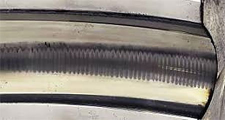 VFDs, on the other hand, typically generate high-frequency current pulses due to the rapid switching abilities of the semiconductors used in electrical conversion. These high frequency pulses cause damage and etching of the bearing and races and remove metal from the ball bearing. This metal transfers from the ball and the races to the lubricant and results in electrical discharge machining (EDM). The damage to the bearing, or EDM pit, causes a deformity in the surface of the bearing, which will draw more pulses and create EDM fluting.