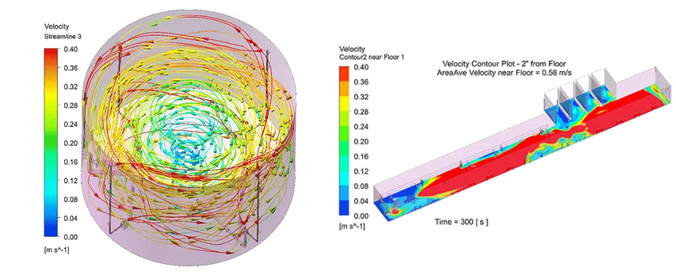 One of the most powerful benefits of CFD is its ability to “look inside the tank.” Traditional field testing relies on limited sampling at discrete points, which may not reveal complete flow patterns. CFD simulations offer comprehensive visualizations such as:
