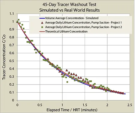 Tracer washout simulations have been invaluable for validating real-world mixing. By simulating a tracer’s movement through a tank—from injection at the pump suction and mixing nozzles, or from another feed location—engineers can compare simulated washout patterns with actual operational data, such as digester feed and bleed cycles.